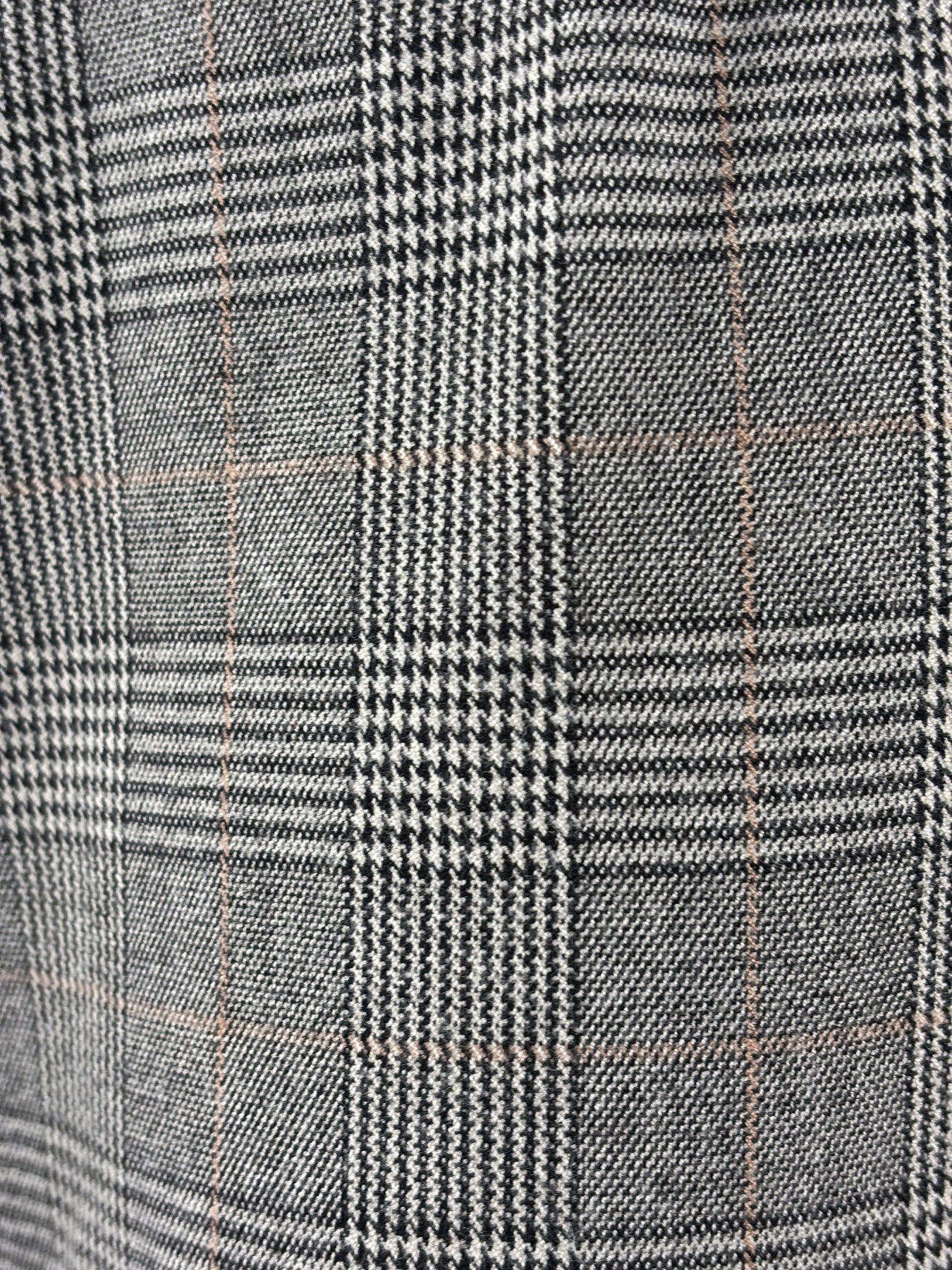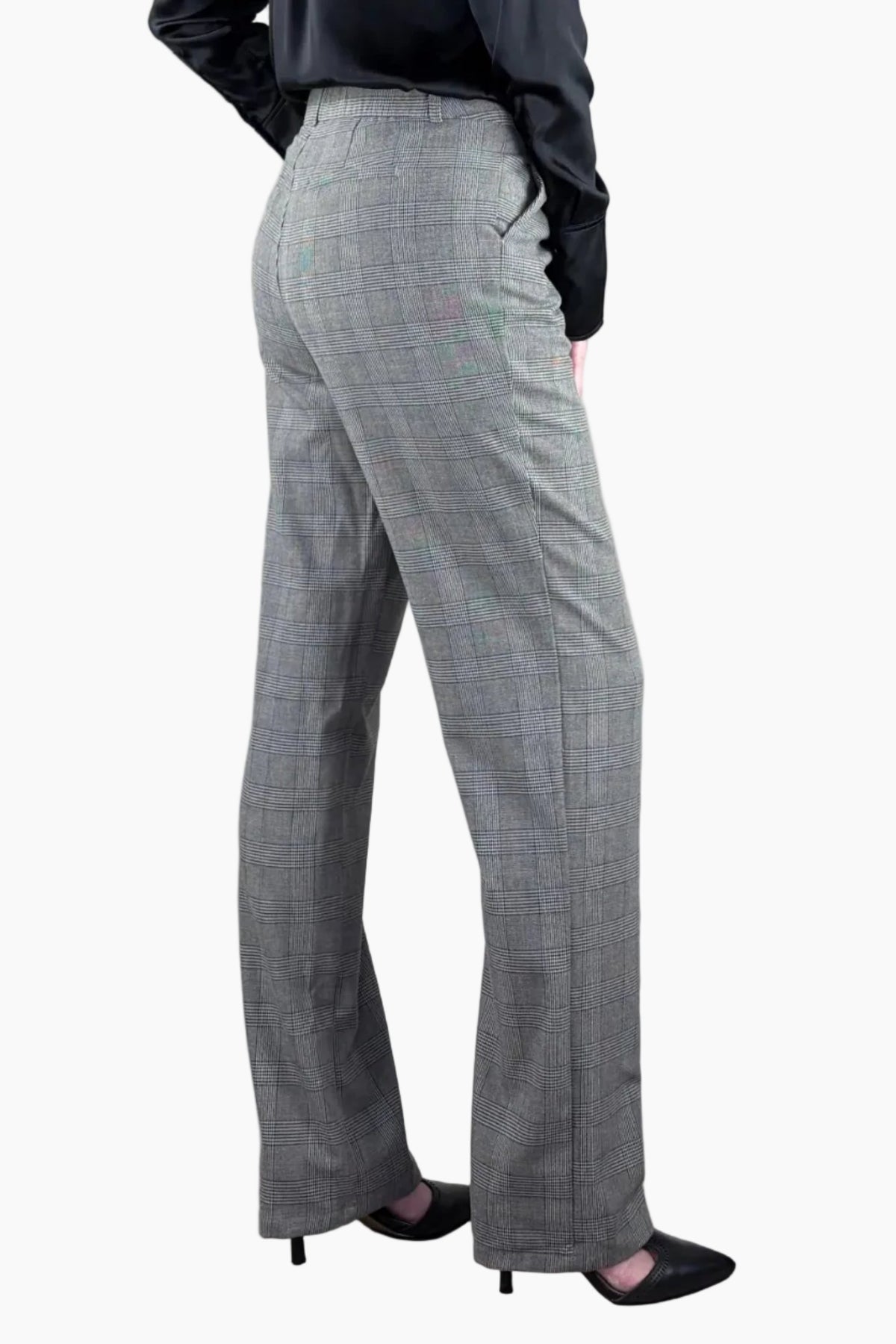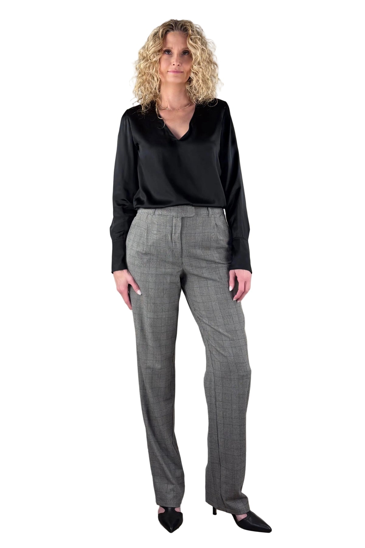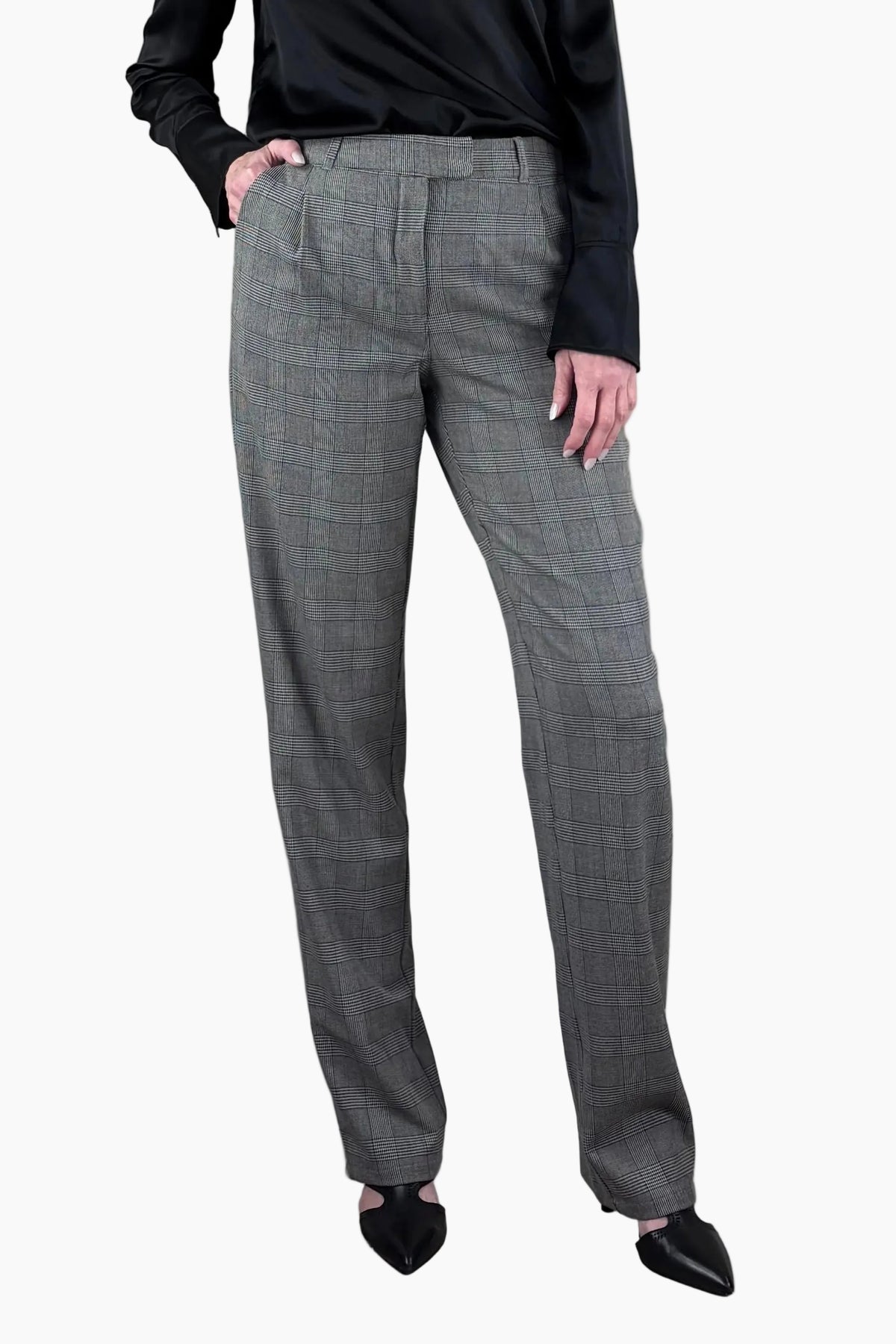 A classic plaid pant should be in every women's closet. Tailored, straight leg style with front pleats and a neutral black, grey, cream and pecan plaid. Crafted of peached, yarn-dyed fabric which is soft, stretchy and drapes beautifully. Sleek, tailored style with a straight cut leg that flatters long legs. Elastic back waistband for comfort. Zip fly and hook closure, front slant pockets, belt loops, and faux back welt pockets make this a perfect pant for the office and beyond.