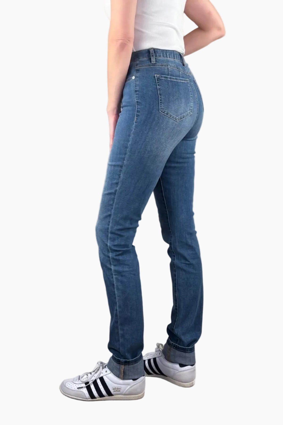 Crafted from premium denim that is super soft with a bit of stretch for all day comfort. Zip and fly closure, 5 pocket styling, light sanding, and whiskers. The slim leg is great on the long legs of a tall women,. Wear them down or cuff them up for a different look. They are shown cuffed, but they do not come cuffed.